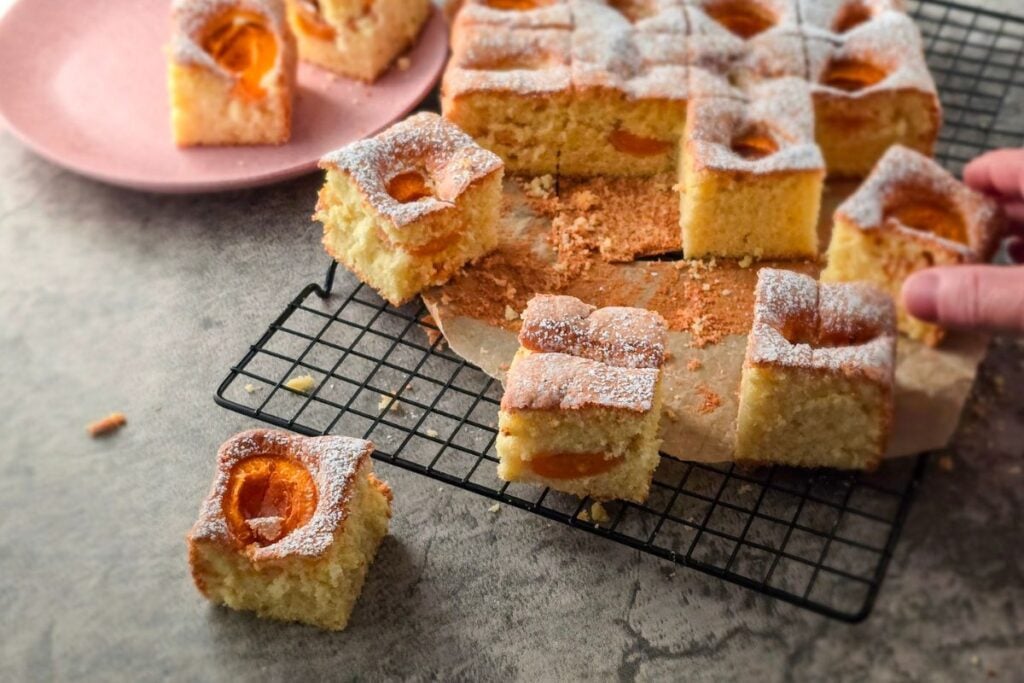 My mum would bake trays of this apricot cake alongside rows of jam jars, gifting them to friends and family. Nothing compares to the aroma of apricots baking into a soft, cloud-like sponge. Now, it’s a tradition in my own kitchen. My husband even requests a whole tray of this apricot cake as his “birthday cake” to take to work (he’s an unapologetic apricot superfan!).