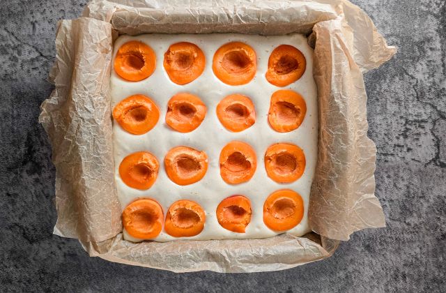 Wash, dry and halve the apricots. Line a rectangular baking tin with parchment paper. Preheat oven to 180°C (350°F).