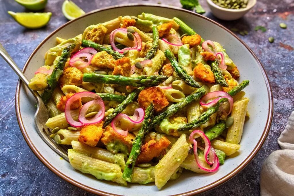 That means real substance: wholewheat pasta, crisp-edged tofu, grilled asparagus, pickled red onions, plenty of herbs, and a bright avocado lime dressing that brings everything together.