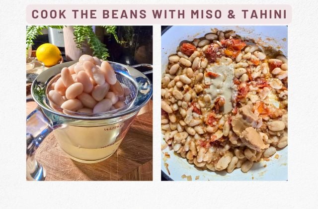 - Add the tahini and miso. Loosen gradually with reserved bean liquid (or a splash of water) until saucy.1 1/2 tbsp tahini, 2 heaped tsp white miso