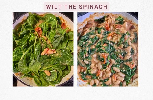 - Add the spinach and gently press it into the beans, adding a splash of water to help it wilt. Cook for 1 to 2 minutes until wilted.100 g spinach